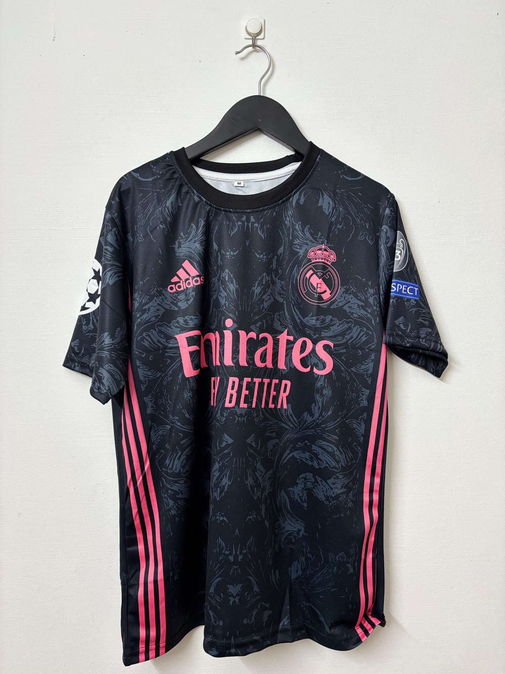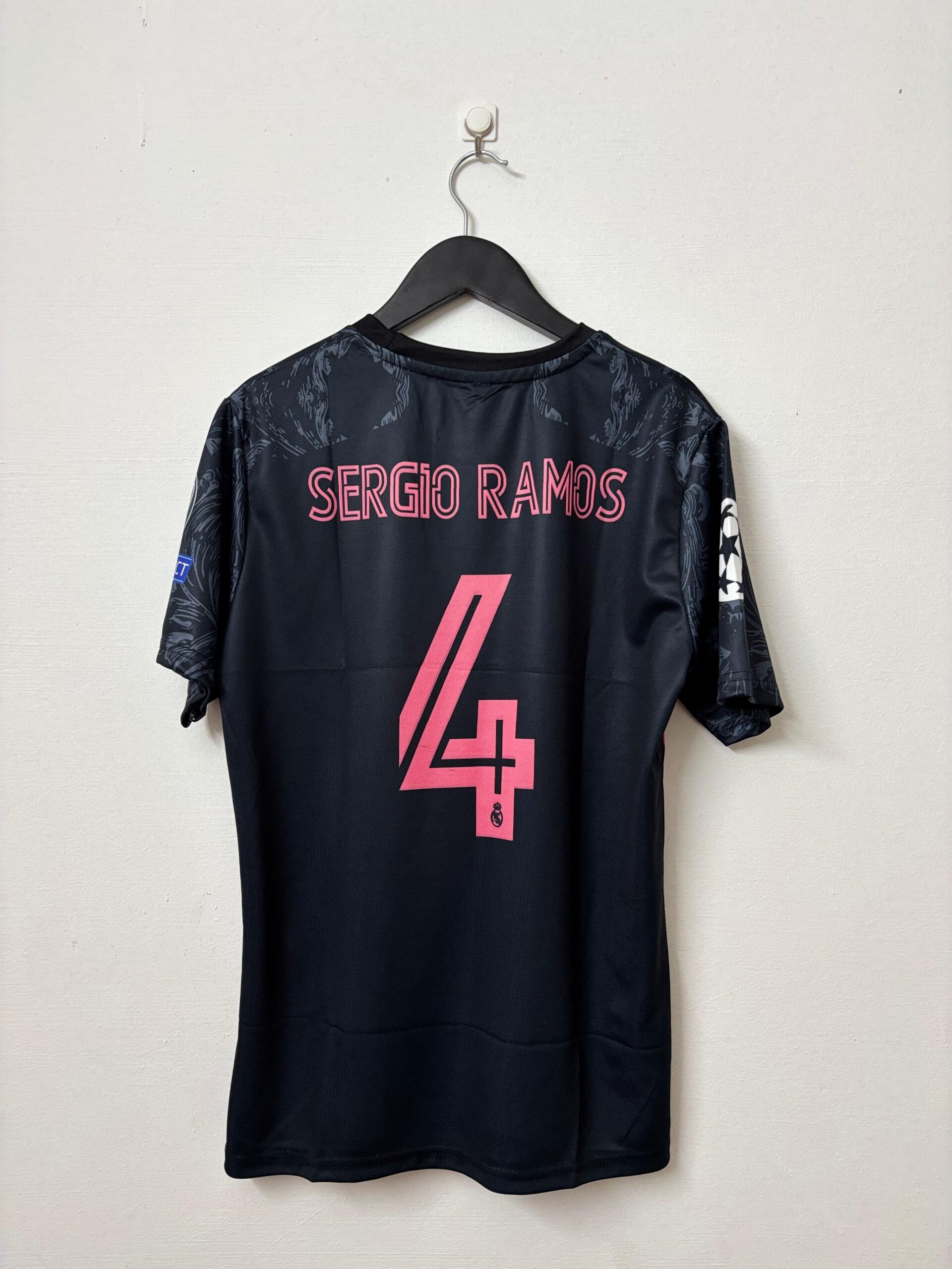 Real Madrid black retro jersey honoring Sergio Ramos with premium sublimation printing. Features authentic design details, team colors, and comfortable fan wear.